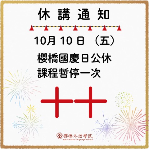 櫻橋外語學院→10/10(五)櫻橋公休哦~ 公休期間 ,如有相關業務請10/10(五)後再與我們洽詢,謝謝