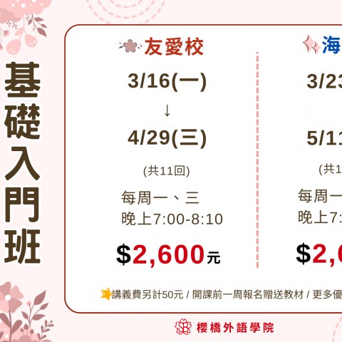 【3月基礎入門班】 櫻橋3月基礎入門,開班囉! 小班制教學名額有限! 歡迎零基礎的學員報名參加 ◇早鳥優惠|開課前一周報名,免費贈送教材 歡迎來電洽詢 (06)221-0701(友愛校) (06)259-1521(海安校) 或私訊粉絲專頁