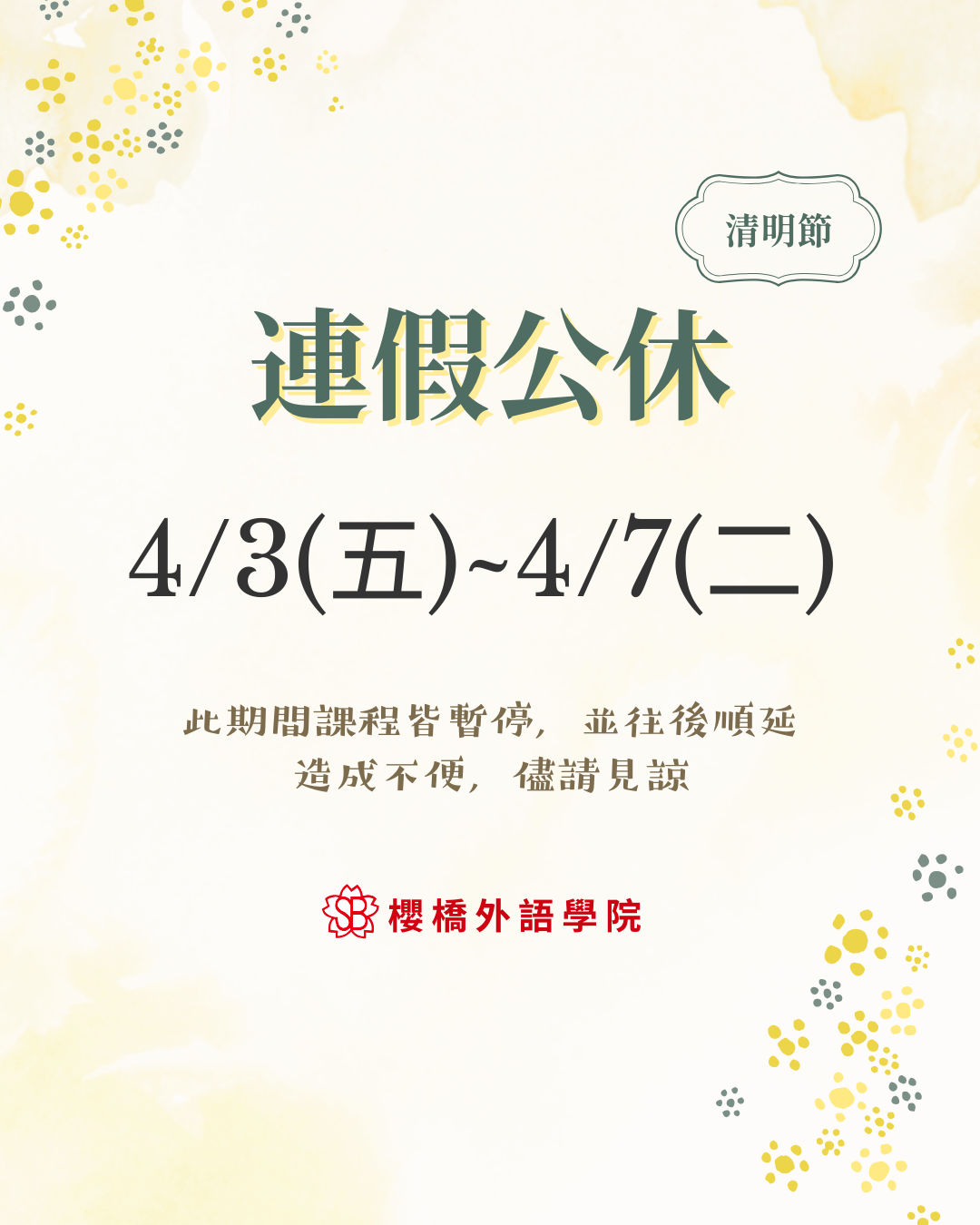 櫻橋外語學院→4/3(五)至4/7(二)清明連假公休哦~