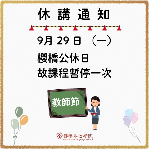 櫻橋外語學院→9/29(一)櫻橋公休哦~ 公休期間,如有相關業務請9/29(一)後再與我們洽詢,謝謝