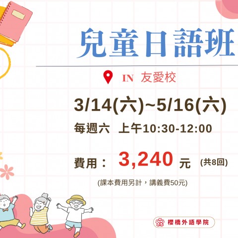 【3月兒童日語班】 櫻橋兒童日語班,開班囉! 小班制教學名額有限! 歡迎零基礎的小朋友報名參加 歡迎來電洽詢 (06)221-0701(友愛校) (06)259-1521(海安校) 或私訊粉絲專頁