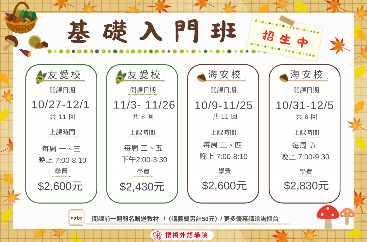 【10.11月基礎入門班】 櫻橋10.11月基礎入門,開班囉! 小班制教學名額有限! 歡迎零基礎的學員報名參加 ◇早鳥優惠|開課前一周報名,免費贈送教材 歡迎來電洽詢 (06)221-0701(友愛校) (06)259-1521(海安校) 或私訊粉絲專頁 更多櫻橋資訊請洽官網|https://reurl.cc/NZ1gyk