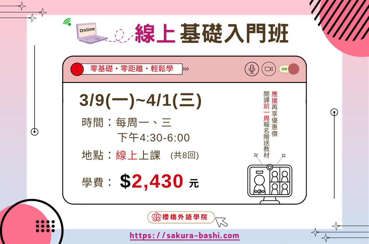 【線上 · 基礎入門班】熱烈招生中! 線上學習超便利 小班制教學名額有限! 歡迎零基礎的學員報名參加 ◇早鳥優惠|開課前一周報名,免費贈送教材 歡迎來電洽詢 (06)221-0701(友愛校) (06)259-1521(海安校) 或私訊粉絲專頁