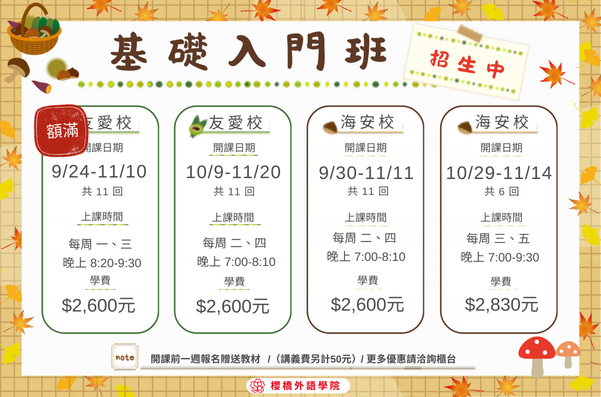【9.10月基礎入門班】 櫻橋9.10月基礎入門,追加開班來囉! 小班制教學名額有限! 歡迎零基礎的學員報名參加 ◇早鳥優惠|開課前一周報名,免費贈送教材 歡迎來電洽詢 (06)221-0701(友愛校) (06)259-1521(海安校) 或私訊粉絲專頁 更多櫻橋資訊請洽官網|https://reurl.cc/NZ1gyk