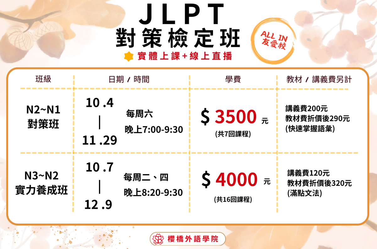 【JLPT對策檢定班】 大家7月通過檢定了嗎? 讓我們一起為12月的考試準備吧 要去外縣市念書的同學也不用擔心 也可以選擇線上方式上課喔 開課前一周報名繳費可享優惠價哦 歡迎來電洽詢 (06)221-0701(友愛校) (06)259-1521(海安校) 或私訊粉絲專頁 更多櫻橋資訊請洽官網|https://reurl.cc/NZ1gyk