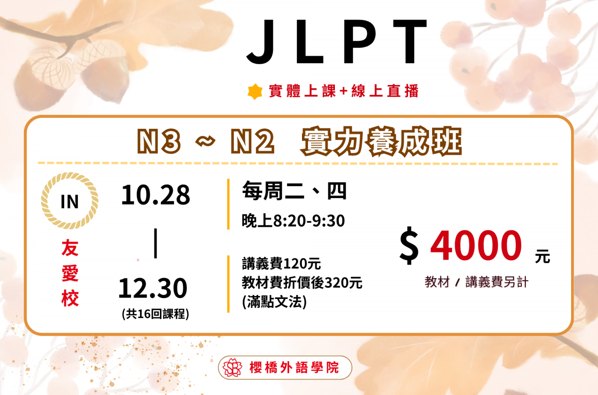 【JLPT N3~N2實力養成班】>>招生中